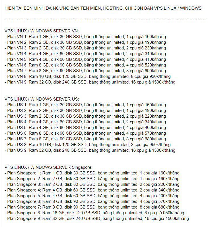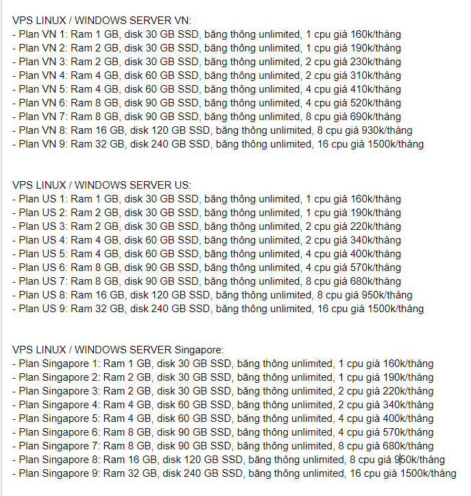 - Plan VN 8: Ram 16 GB, disk 120 GB SSD, băng thông unlimited, 8 cpu giá 900k/tháng